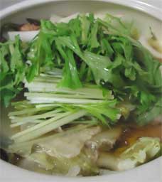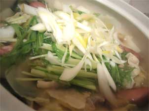 再びフタをして水菜がしんなりしてきたら、長ネギをのっけて完成です♪