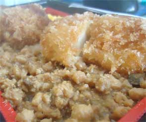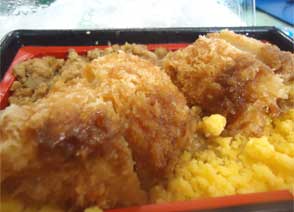 逆から撮ってみた。手前から鶏そぼろ、鶏カツ、玉子。